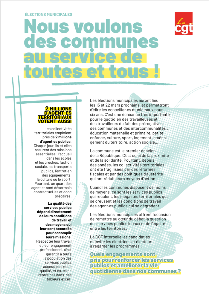Les élections municipales sont les 15 et 22 mars prochain. La CGT, fidèle à son Histoire, à ses valeurs, à ses résolutions s’engagent pleinement dans cette campagne pour: améliorer les […]